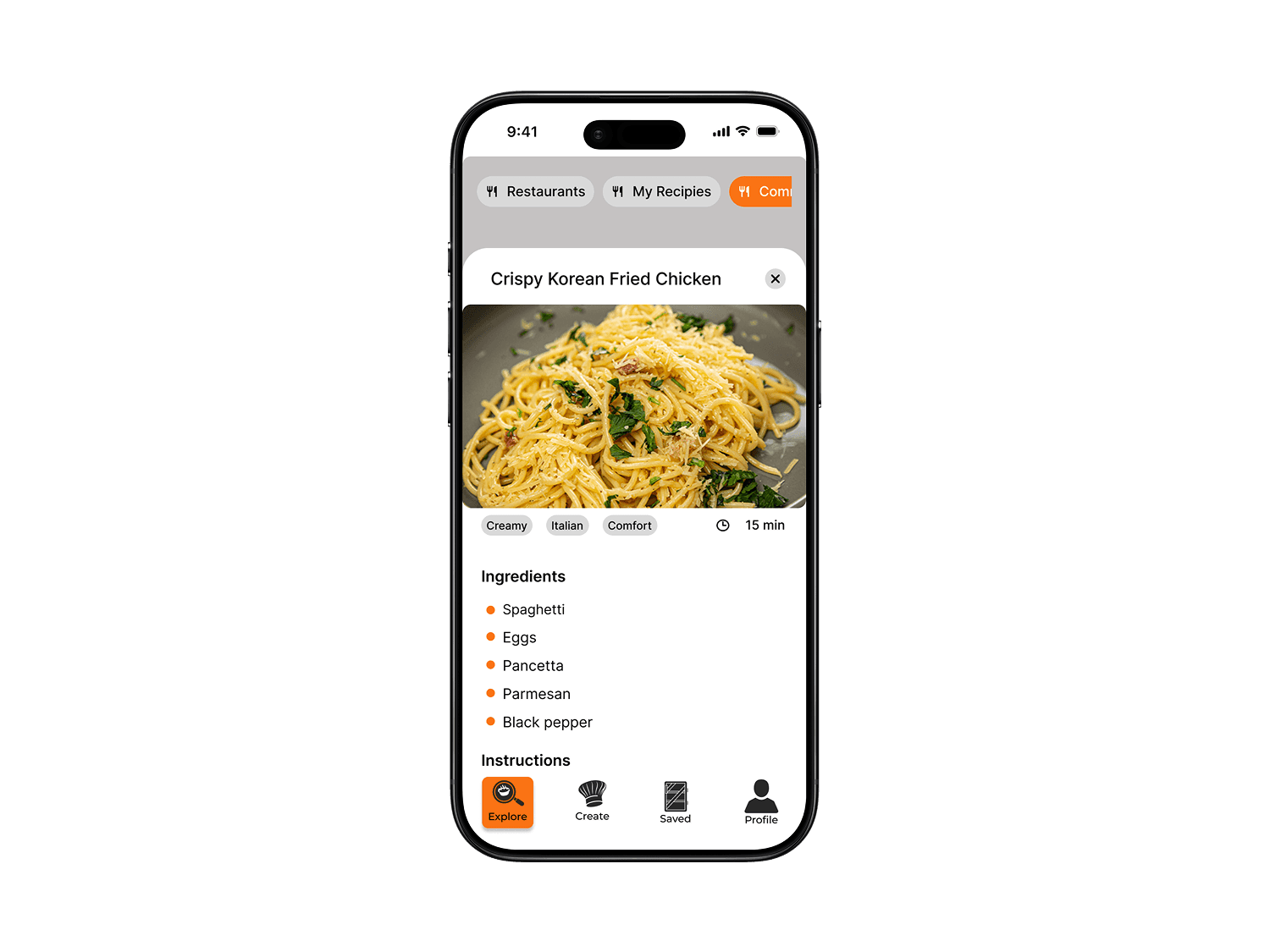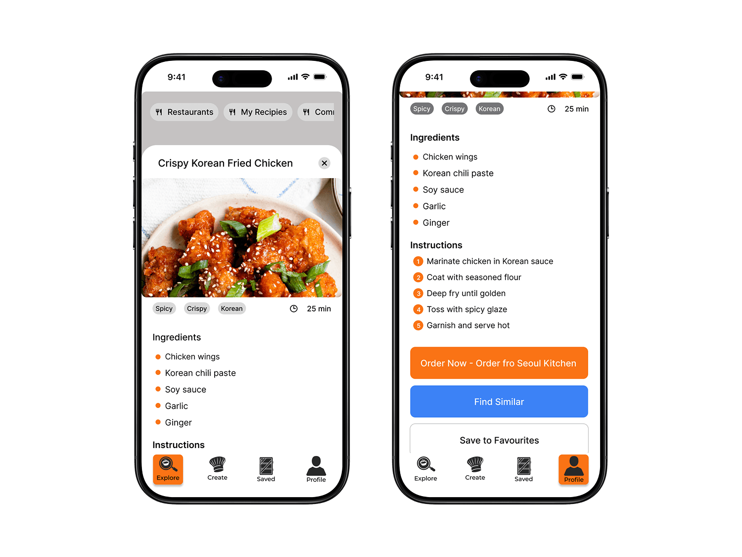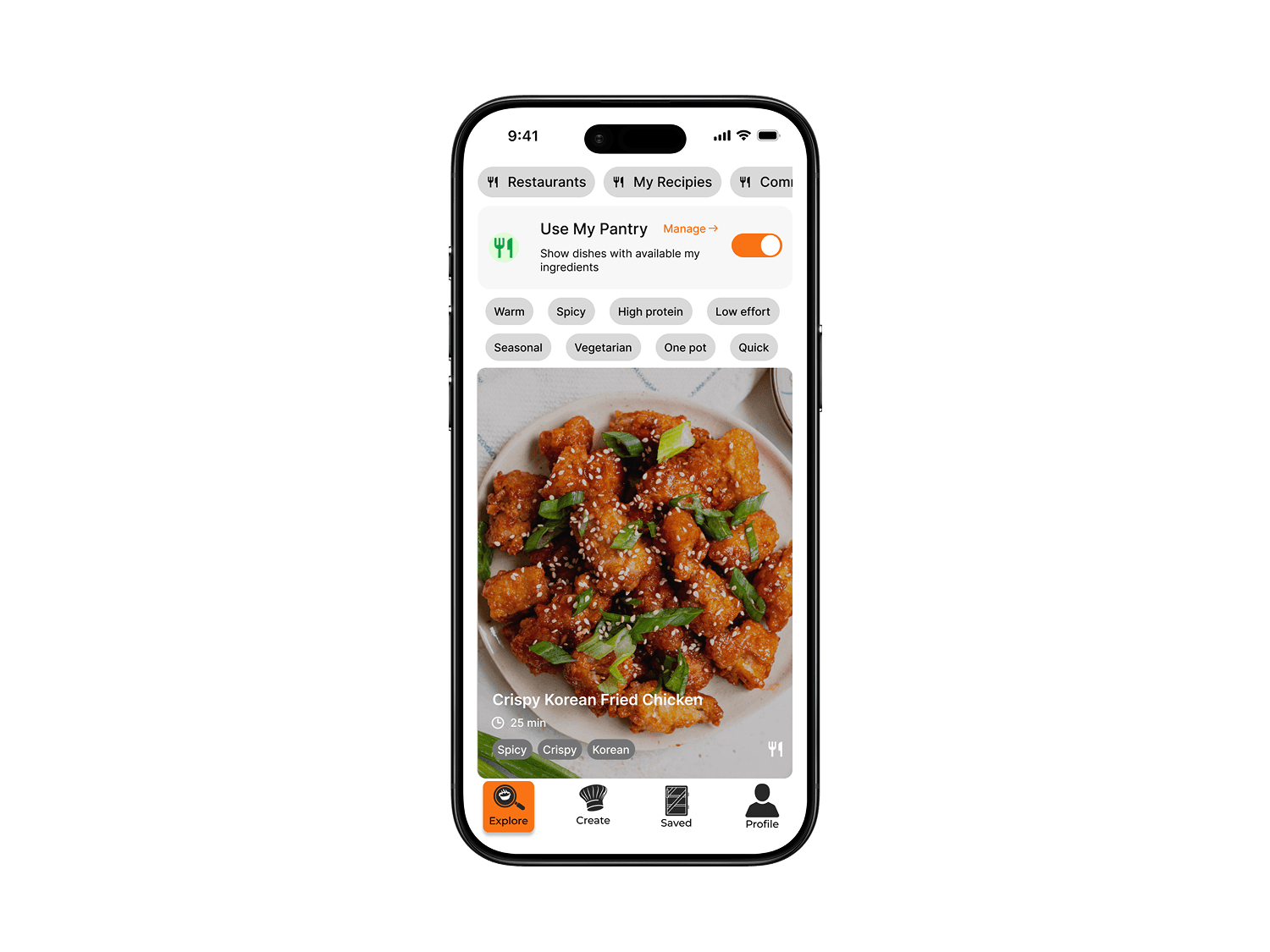 • Rationale (Instant Feasibility Check): The single biggest block to meal selection is feasibility. By filtering the source upfront, the user only sees options relevant to their current goal (e.g., ordering delivery vs. cooking a personal favorite), eliminating immediate option paralysis.
