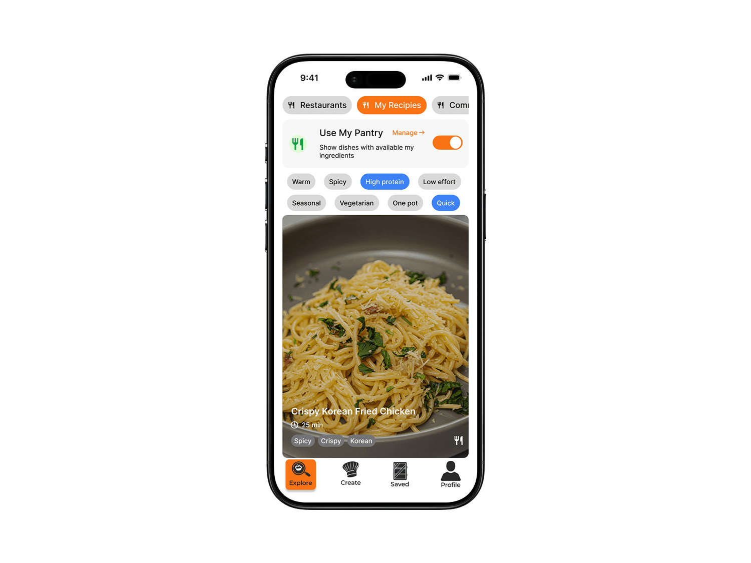 • Description: Four pill options—Restaurants, Community, My Recipes, Mixed. Instantly filters the deck.